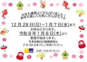 2025年12月27日(土曜日) / 最終更新日時 : 2026年1月8日(木曜日) koriyama-win お知らせ 冬期休館日のお知らせ あけまして おめでとうございます 今年一年が 素晴らしい年となりますように お祈りいたします! 新年1月7日までは冬期休館日となります。 新年の教室開始は、 1月8日(木)からとなります。 新型コロナウイルス対策にご協力お願いします ※お申込、お問合せは: 024-962-4333 まってるよ!